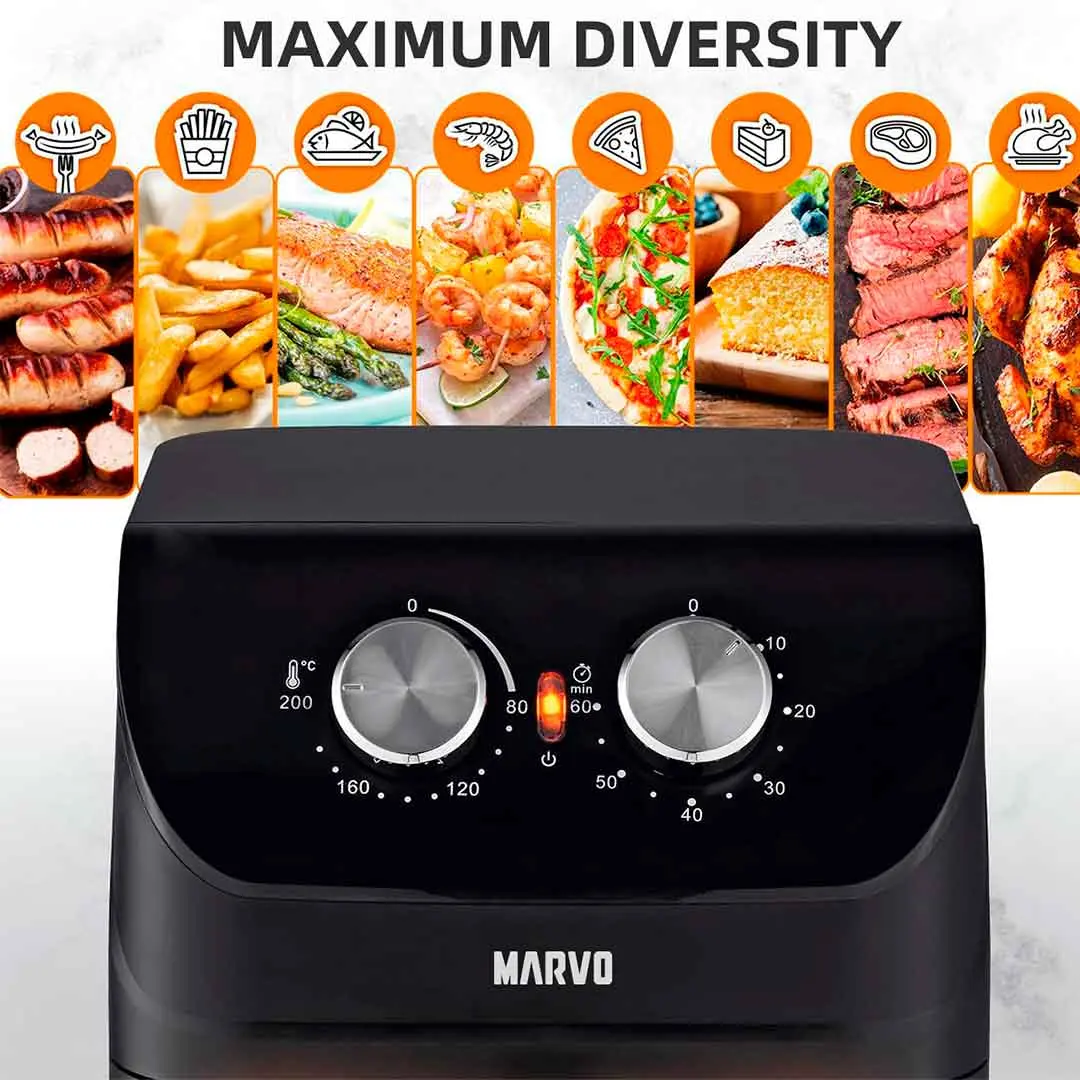 Disfrutá de una cocina más saludable con las freidoras de aire Marvo, diseñadas para reducir el uso de aceite sin perder el sabor ni la textura crujiente de tus comidas favoritas. Con un diseño moderno disponible en blanco o negro, se adaptan perfectamente a cualquier estilo de cocina. Su tecnología de cocción uniforme y su capacidad práctica las convierten en la opción ideal para preparar recetas rápidas, sanas y deliciosas en el día a día.