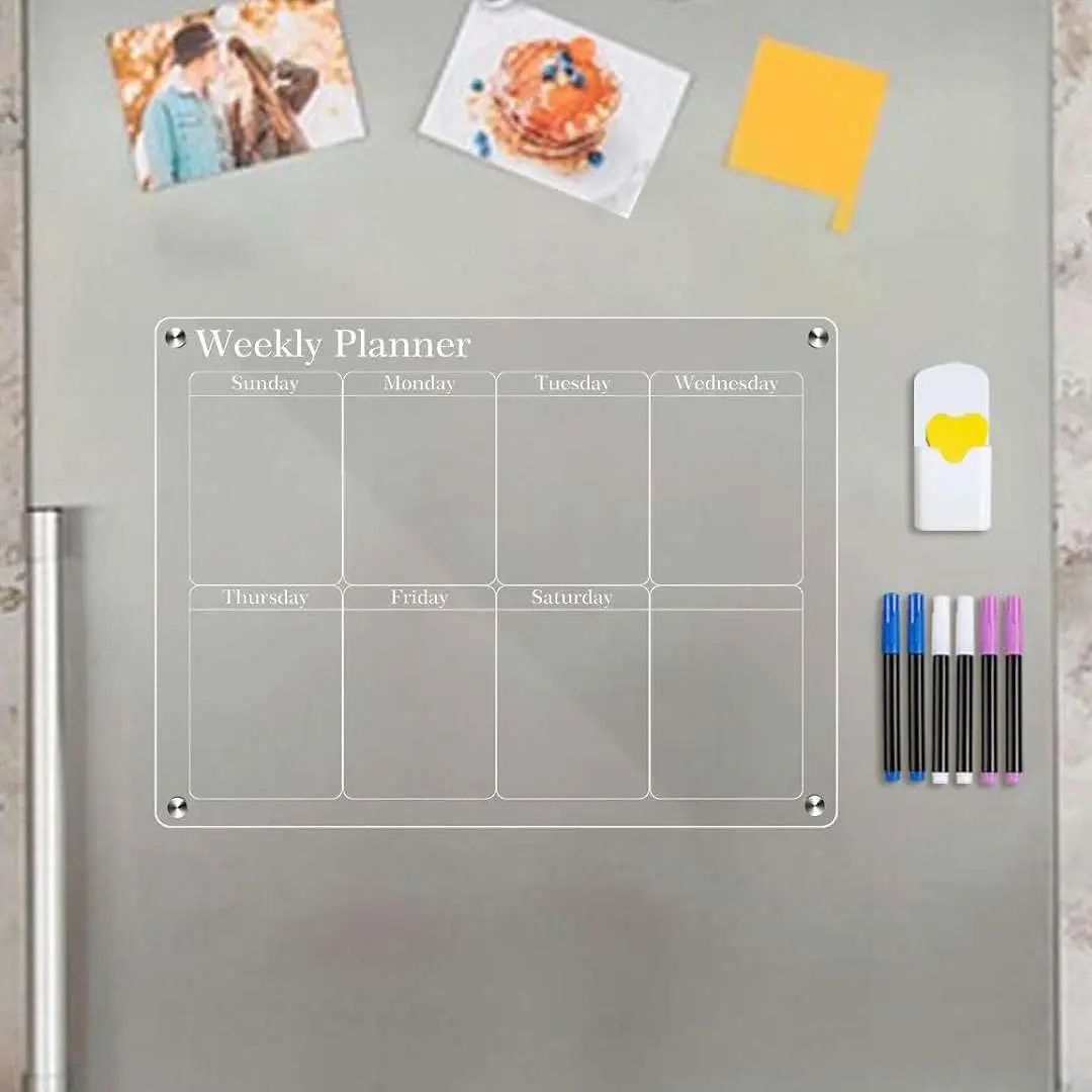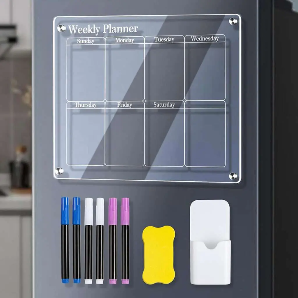Organizá tu semana de manera práctica y ordenada con esta pizarra magnética acrílica. Perfecta para anotar recordatorios, tareas, metas y horarios, se adhiere fácilmente a superficies metálicas como la heladera. Incluye marcadores para que puedas escribir y borrar sin complicaciones.